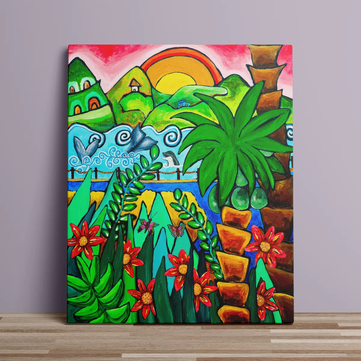Små sommerhuse i bakkerne, en delfin i bølgerne og sommerfugle mellem planterne skaber en fortælling om frihed og glæde.