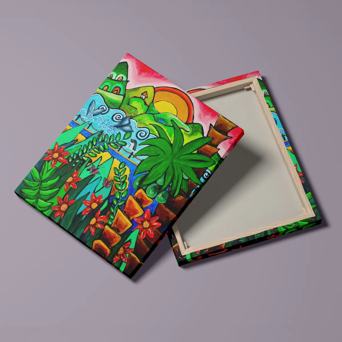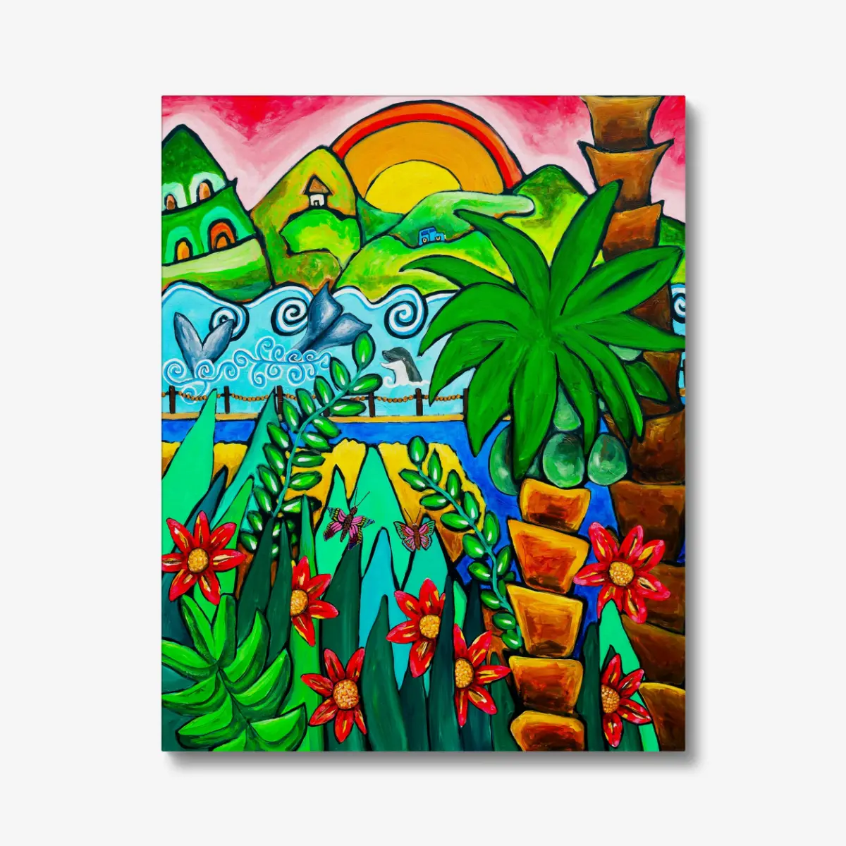 Et unikt lærredsprint, der bringer sommerstemning og farver ind i rummet.