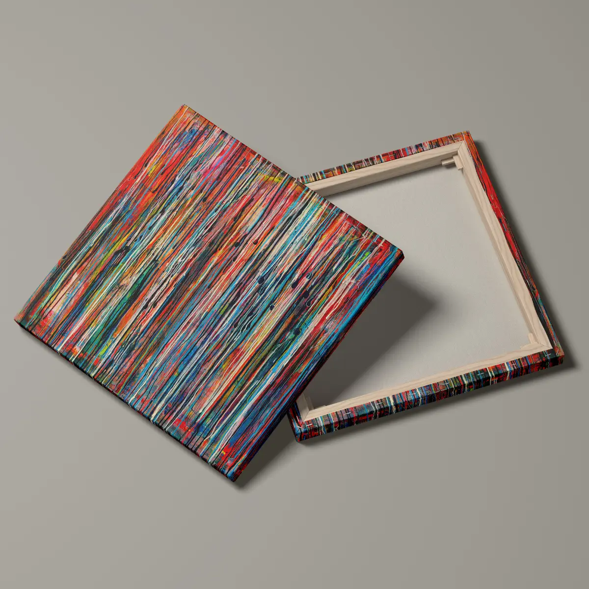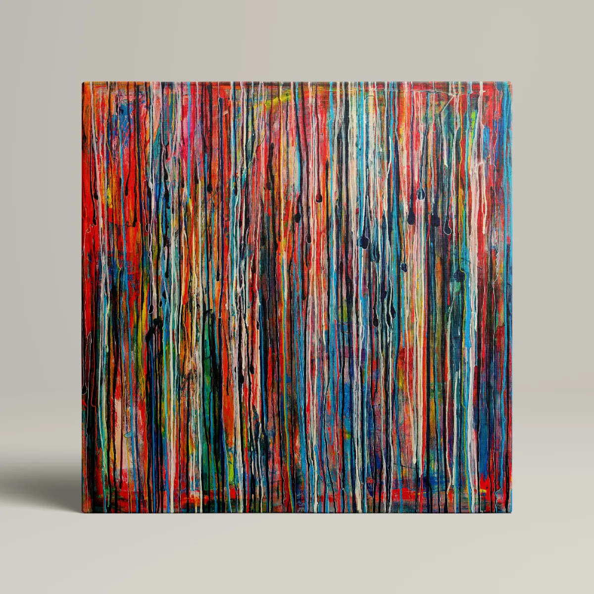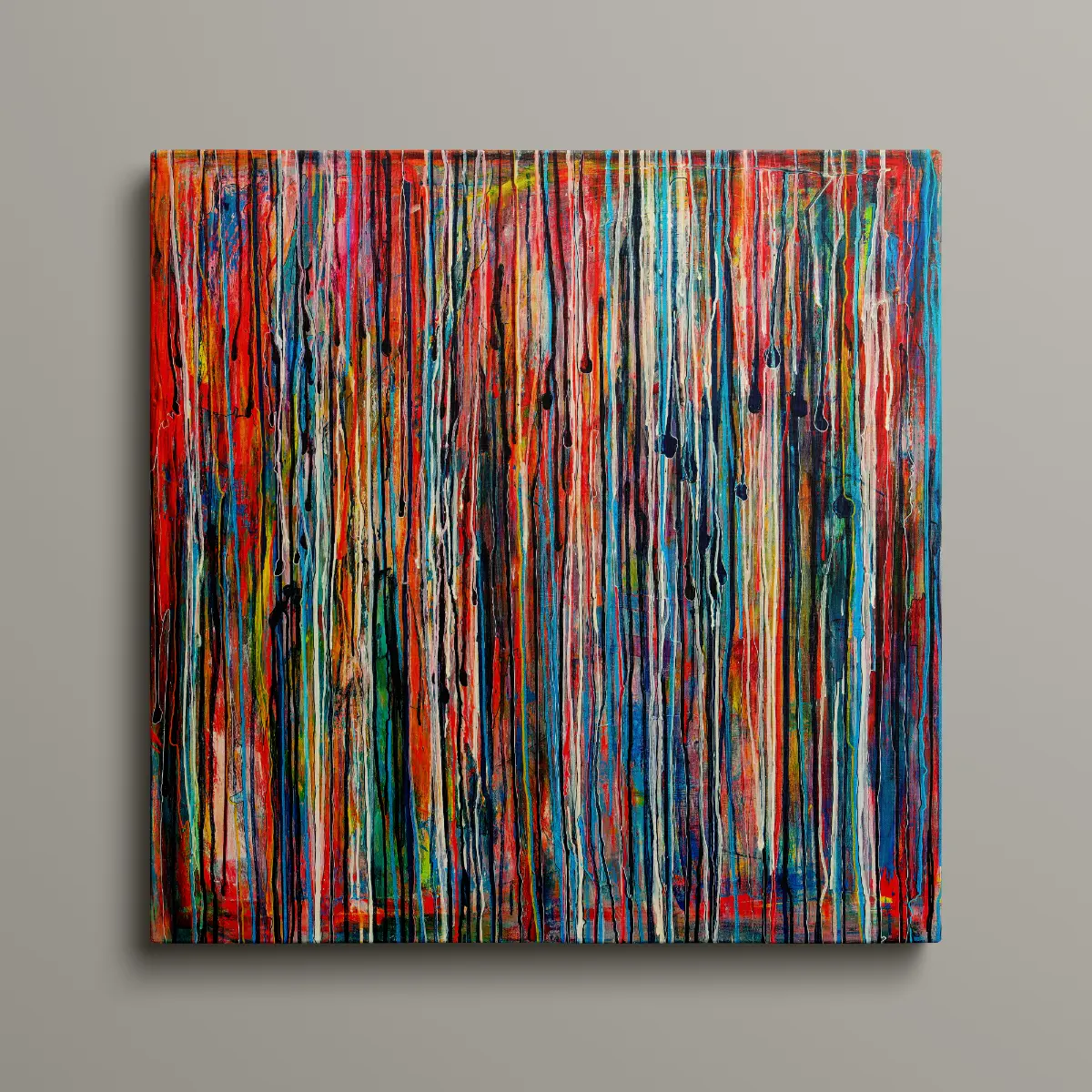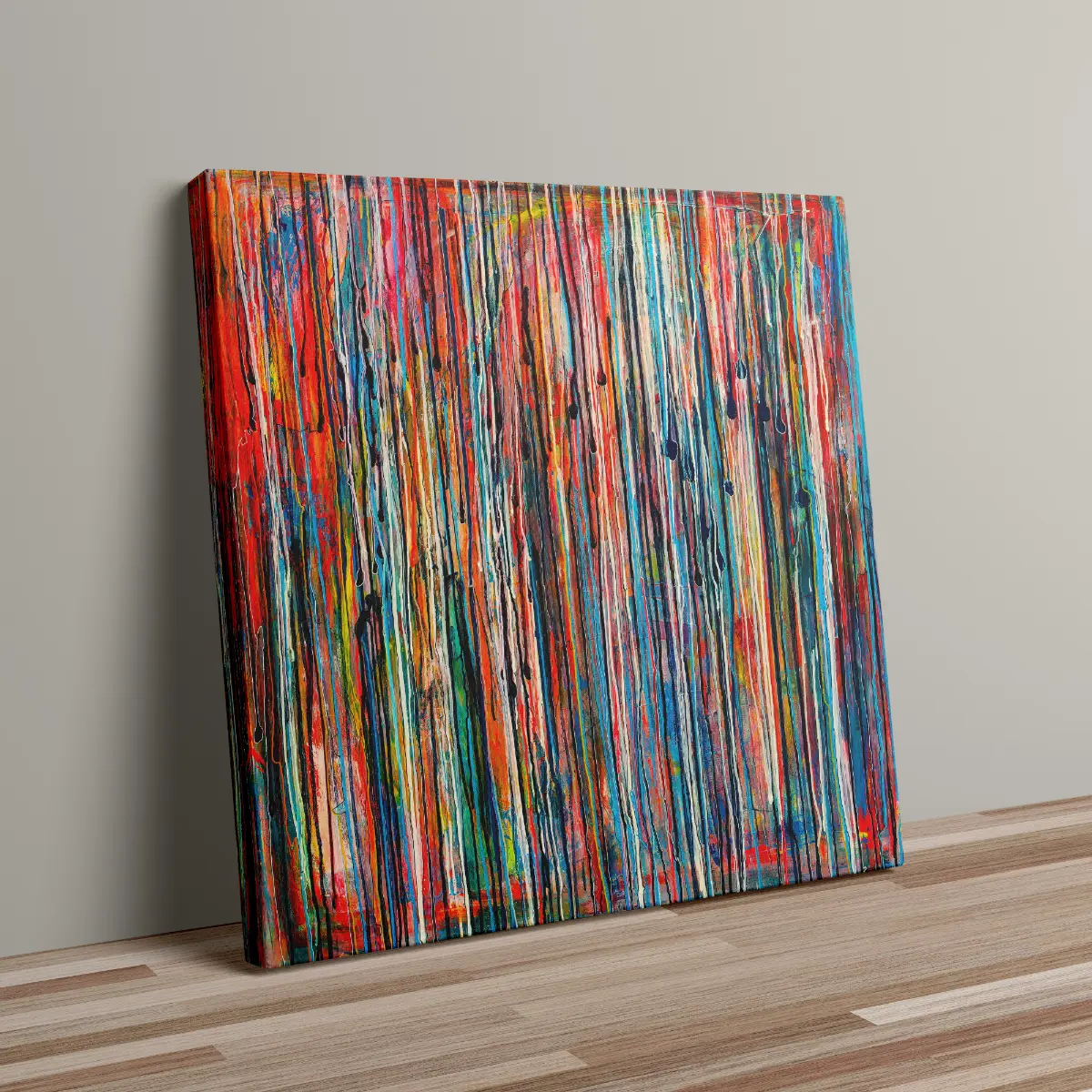 Drops of Art lærredsprint på eksklusivt kunstlærred. Abstrakt og farverig moderne vægkunst med lodrette farvedråber og stærk visuel effekt. Mange farver.