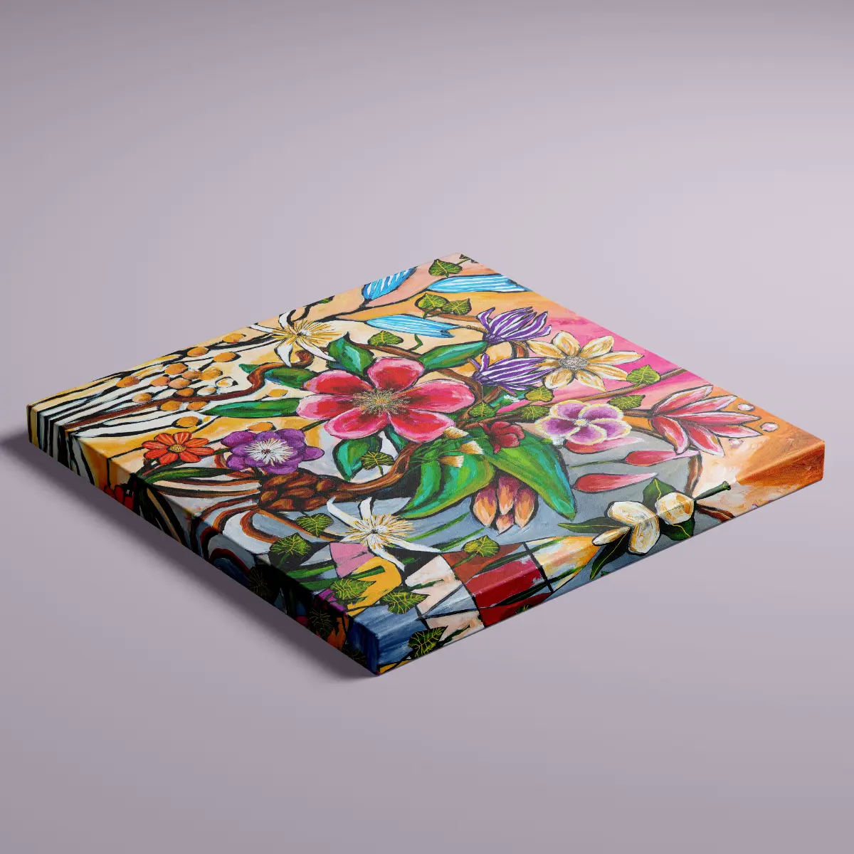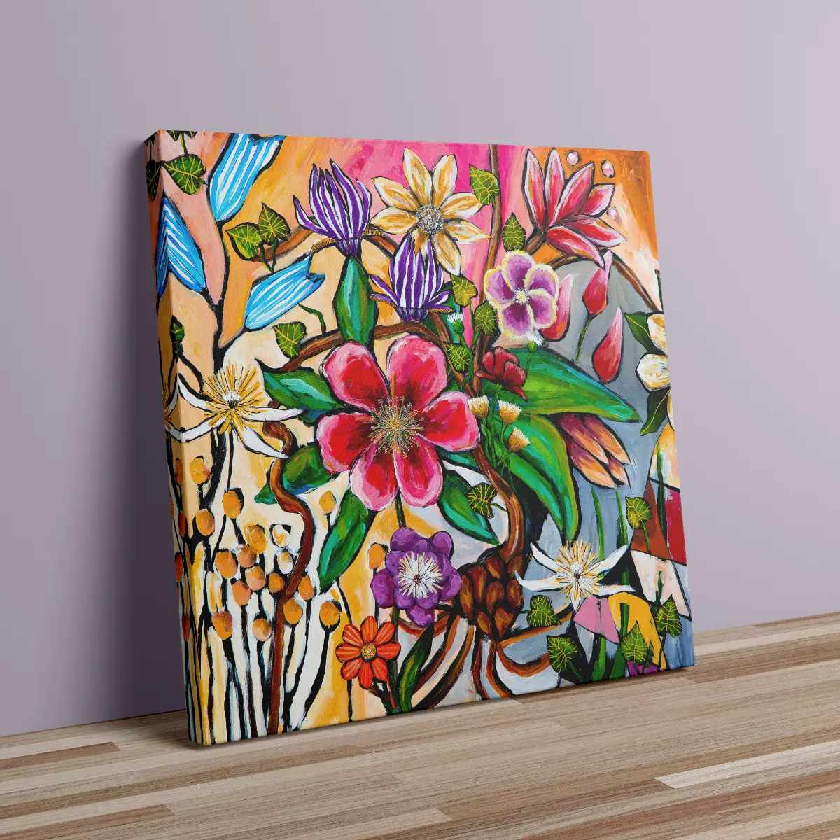Store, åbne blomster i pink, lilla, rød, gul og hvid folder sig ud på lærredet og skaber et levende og energifyldt udtryk.