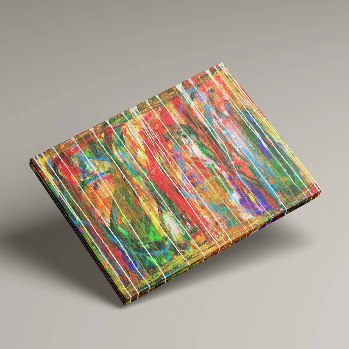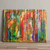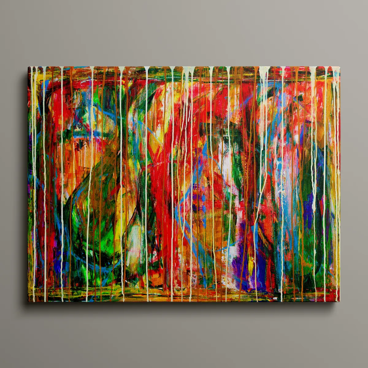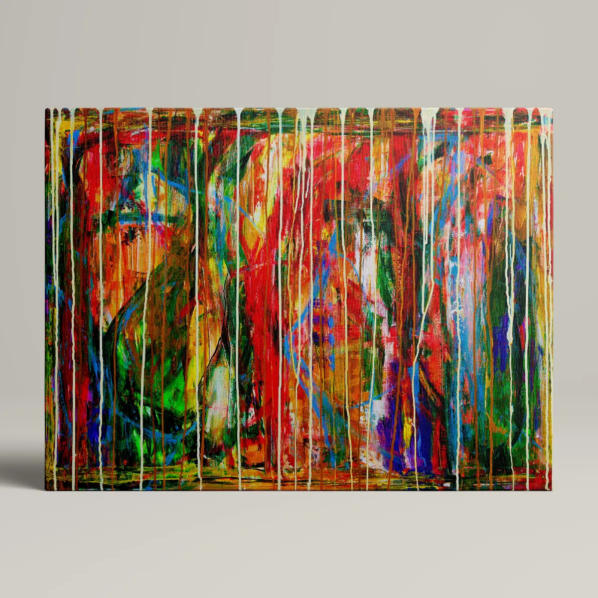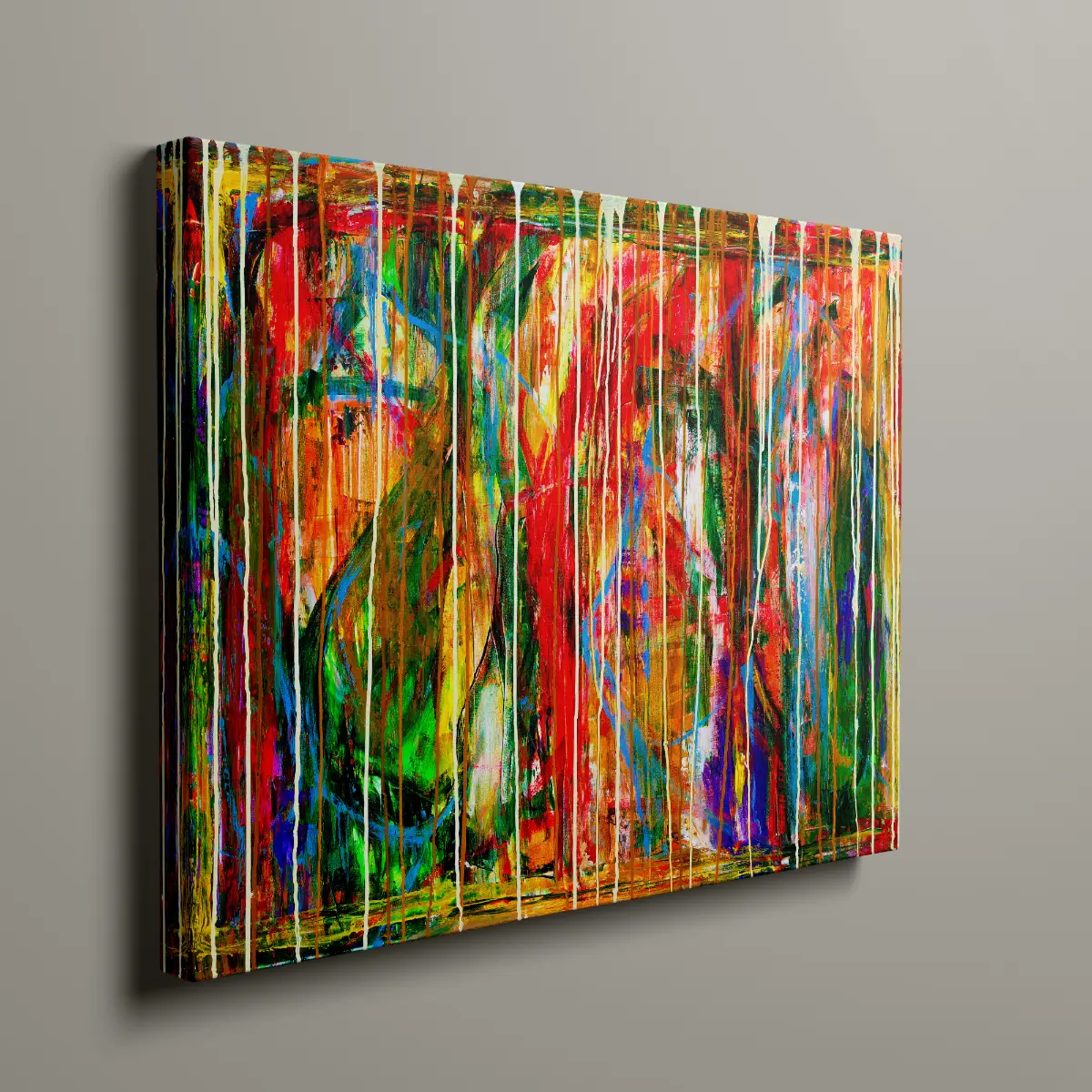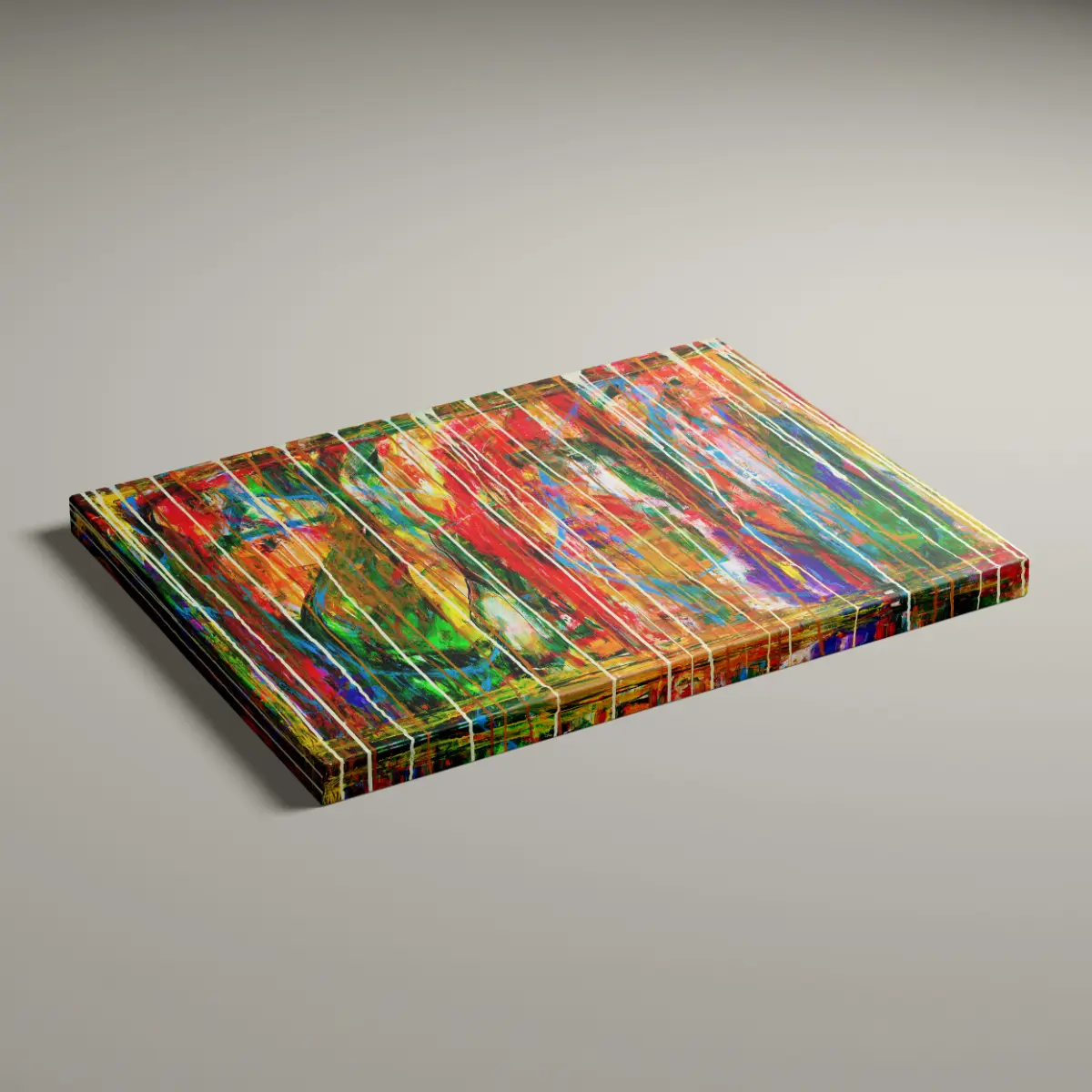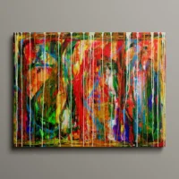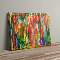 Motivet er abstrakt og energifyldt, hvor lag på lag af farver og bevægelige penselstrøg smelter sammen i en intens og dynamisk komposition.