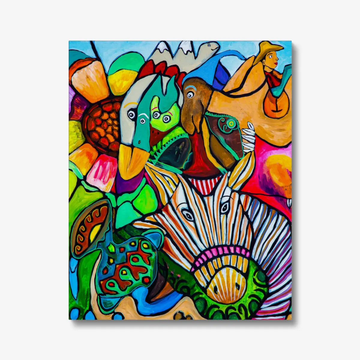 I Happy Adventure mødes zebra, hest og fantasifulde ansigter i en komposition, der næsten minder om et farverigt puslespil.