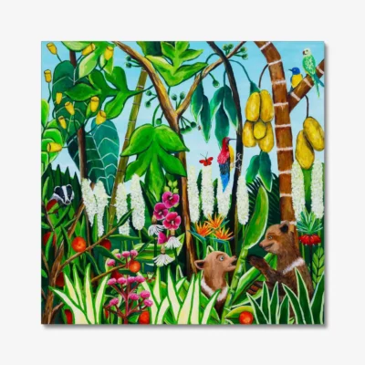 Motivet forener eksotisk dyreliv og frodig natur i en harmonisk komposition, hvor ro og livsglæde smelter sammen i ét samlet udtryk.