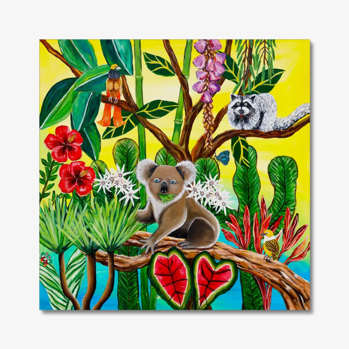 Nirvana lærredsprint på eksklusivt kunstlærred. Farverig naturkunst med koala og eksotiske dyr, håndspændt på blindramme.
