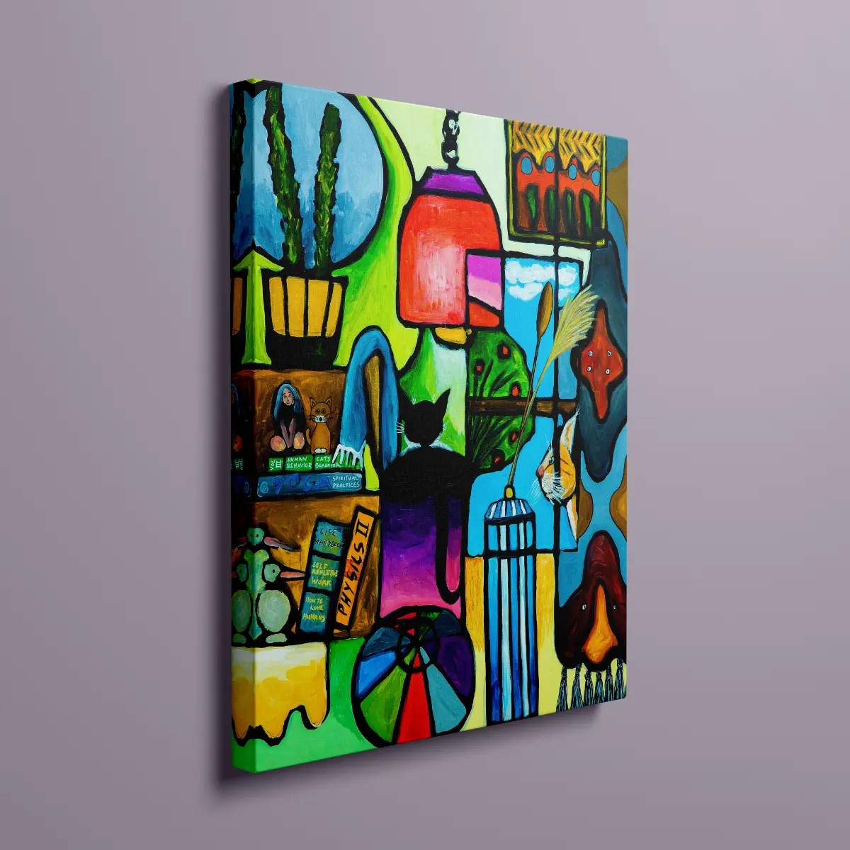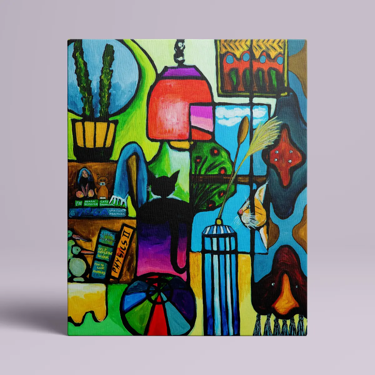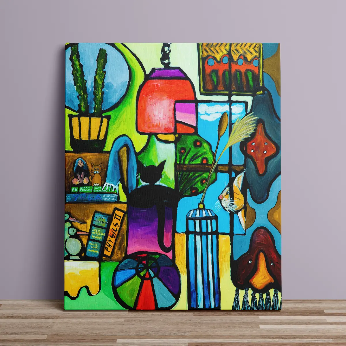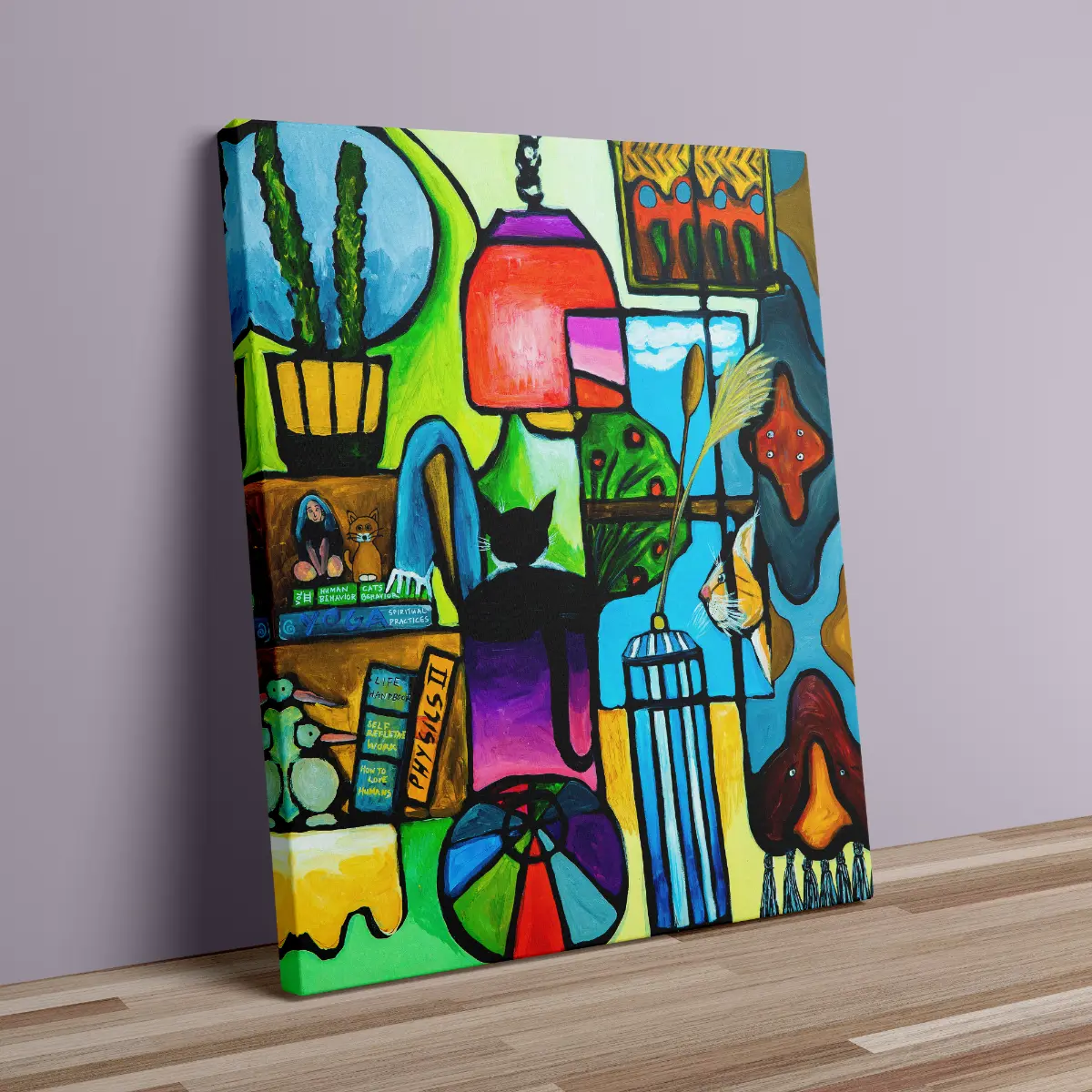 No Place Like Home lærredsprint på eksklusivt kunstlærred. Personlig og farverig vægkunst med katte, håndspændt på blindramme. Smukke og varme farver.