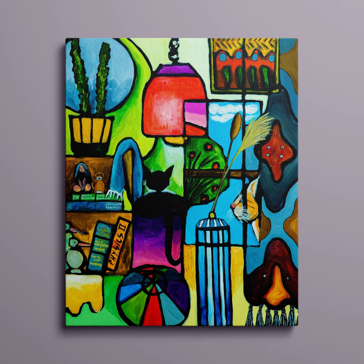 Motivet er inspireret af mit eget hjem og mit eget liv, og de to katte i værket er mine egne.