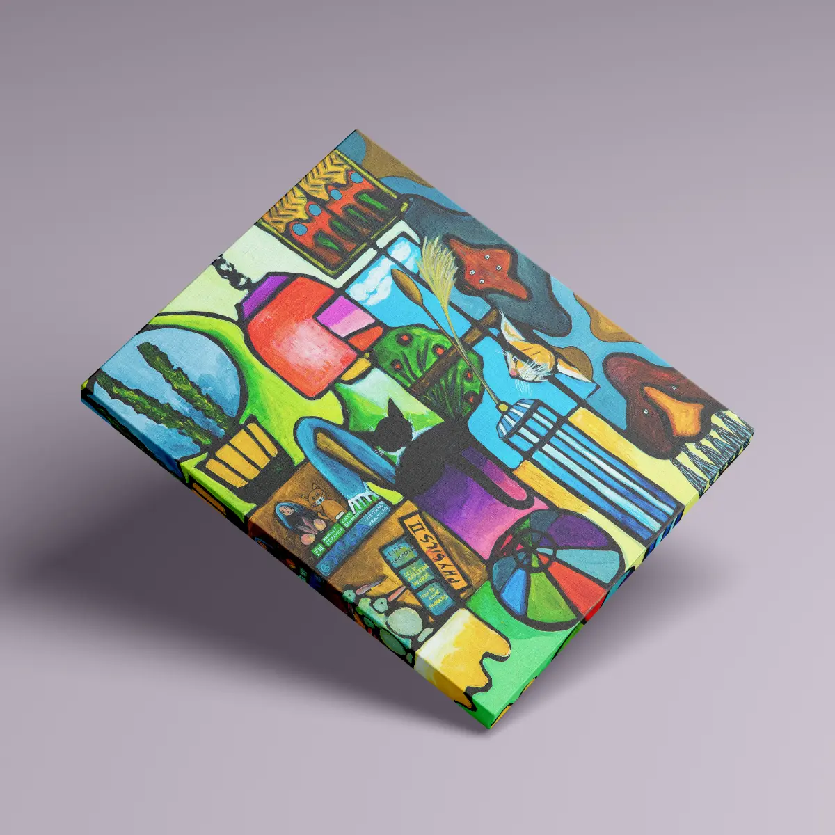 De grafiske felter opdeler motivet i små fortællinger, næsten som et visuelt dagbogsopslag fra et hjem fyldt med kreativitet og refleksion.