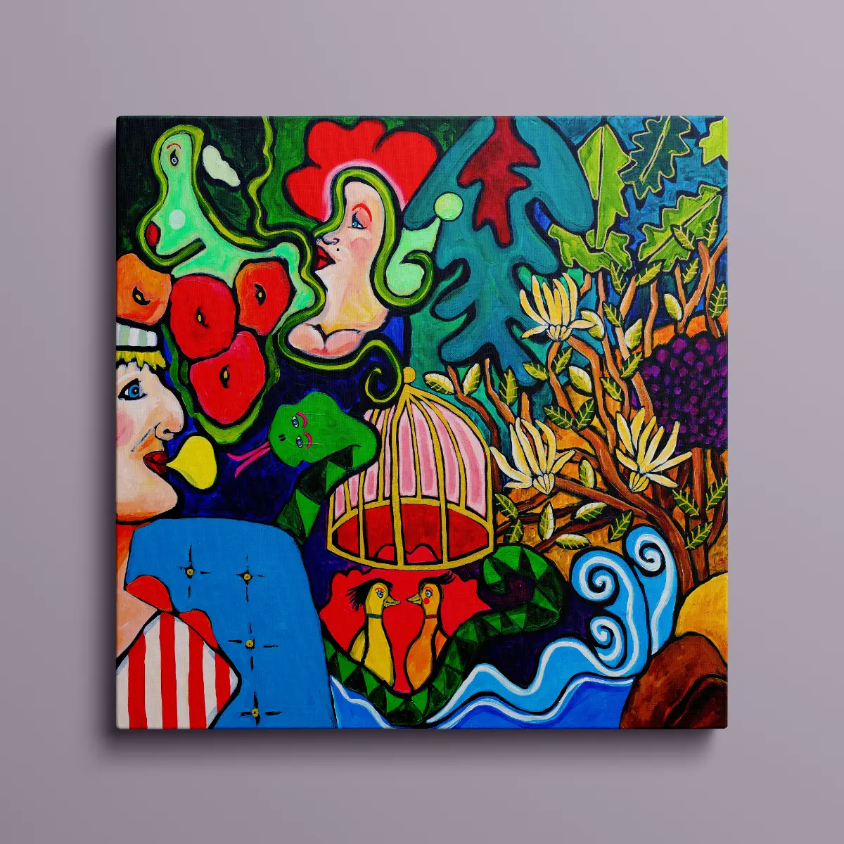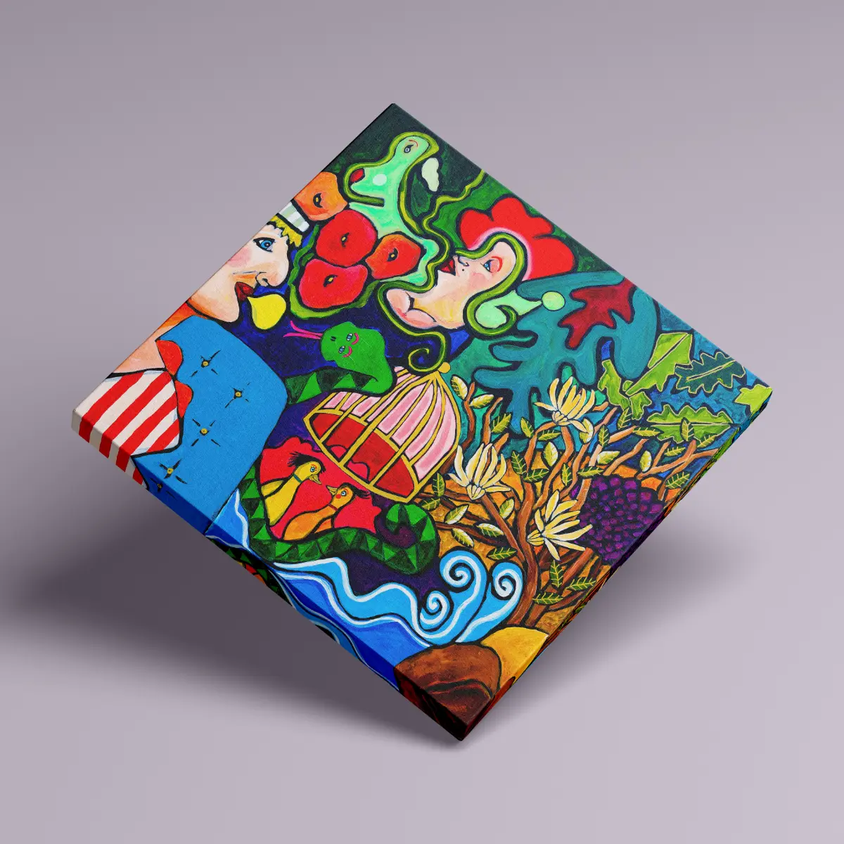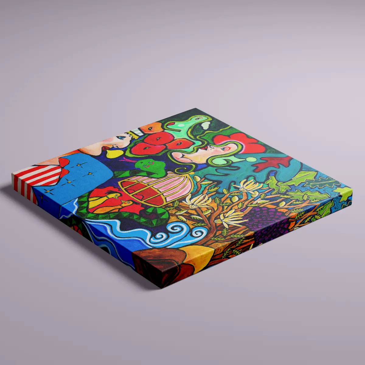 Motivet udfolder en sanselig og dramatisk fortælling om kærlighed, fristelse og samhørighed, hvor mennesker, dyr og natur smelter sammen i en farverig og ekspressiv komposition.