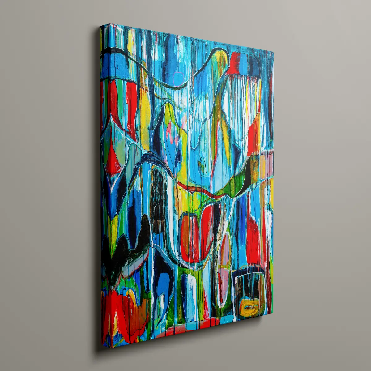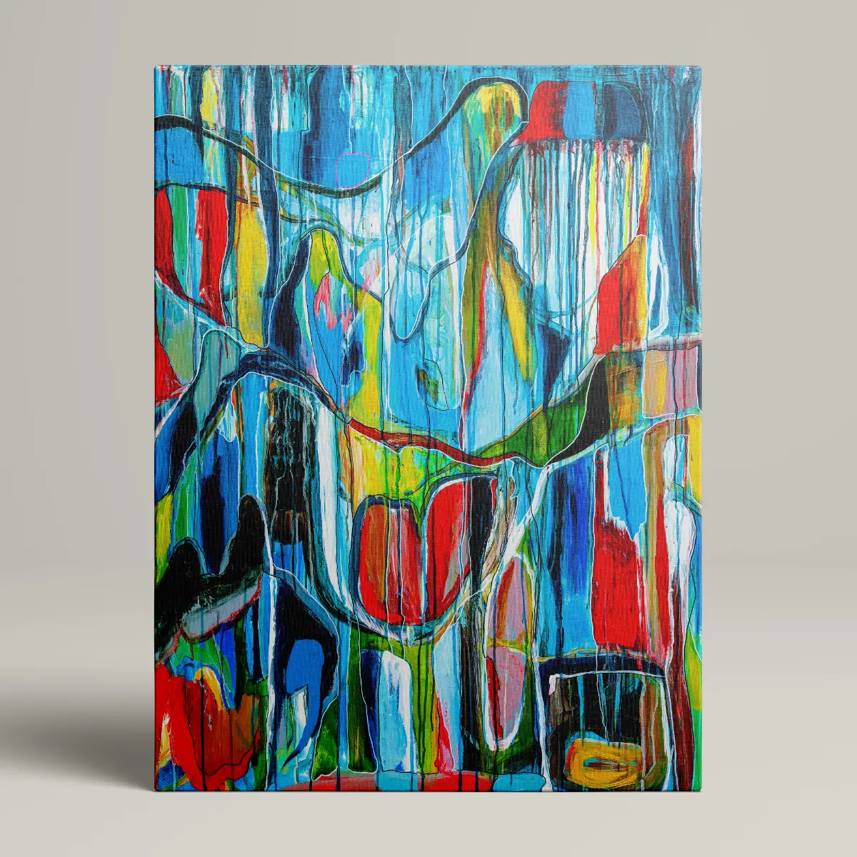 De flydende former og lange, lodrette dryp giver værket et vådt og levende udtryk, som om farverne stadig er i bevægelse.