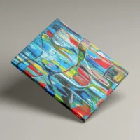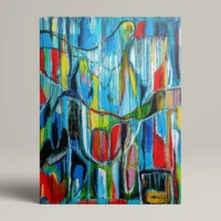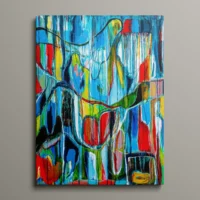 Kølige blå og turkise nuancer danner fundamentet i kompositionen, mens varme indslag af rød, gul og grøn bryder fladerne og skaber kontrast.